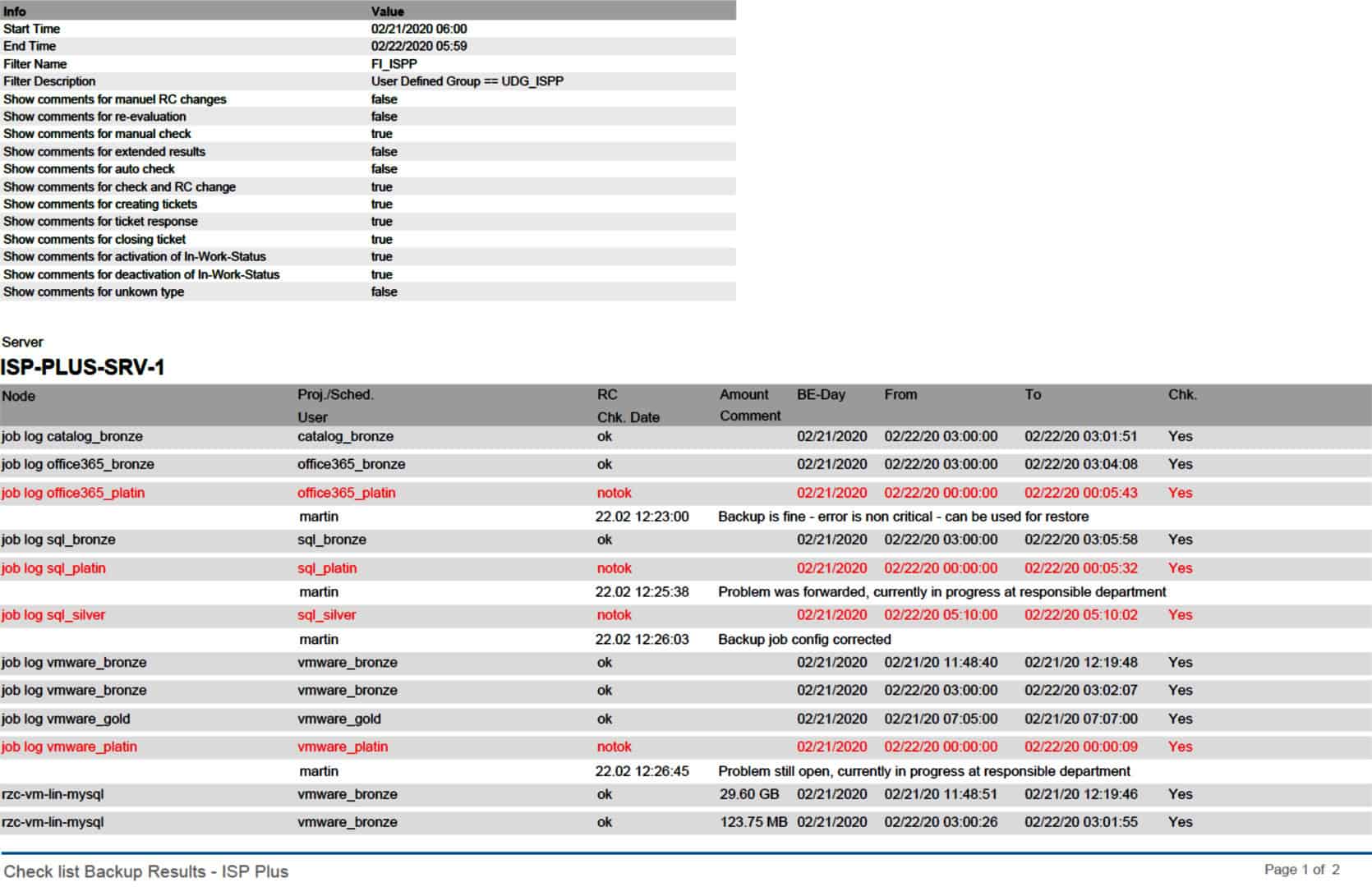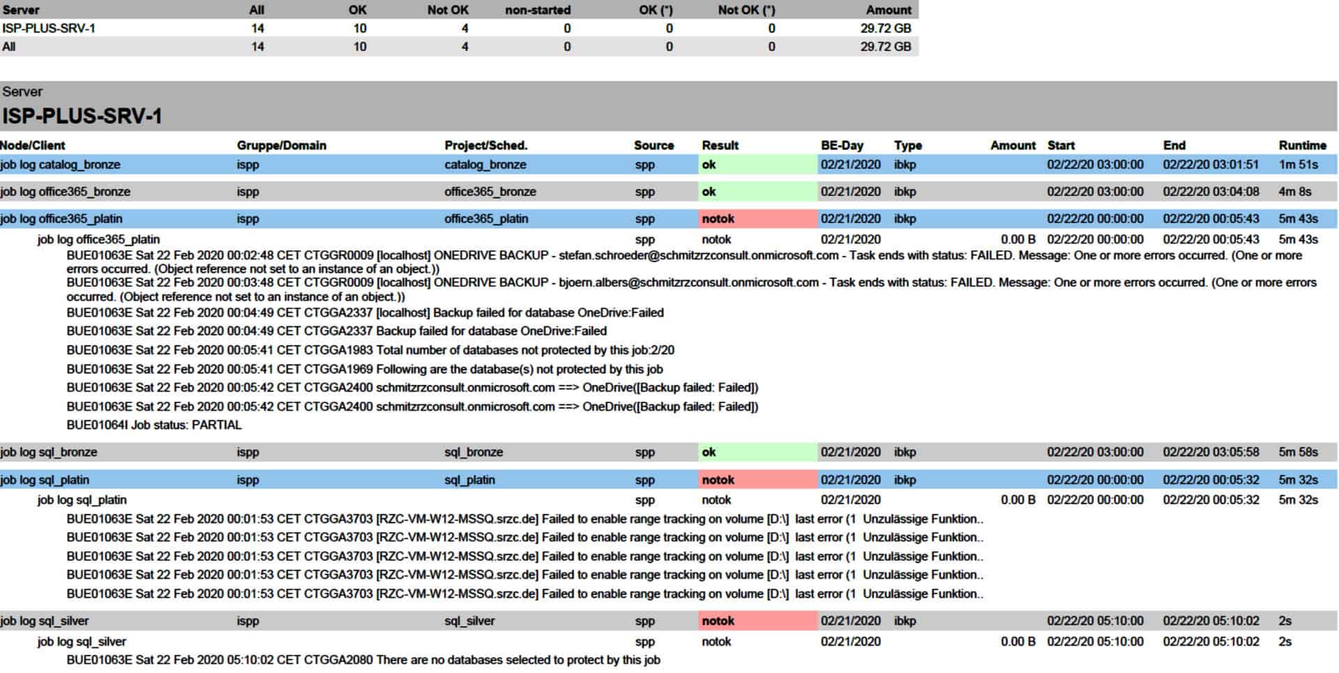 All BACKUP EAGLE® reports can be configured for any period of time and any desired format (~.pdf, ~.html, ~.csv, ~.xls). Content can be easily filtered (servers, nodes, schedules, domains, return codes, …). The BACKUP EAGLE® standard reports are automatically generated daily.