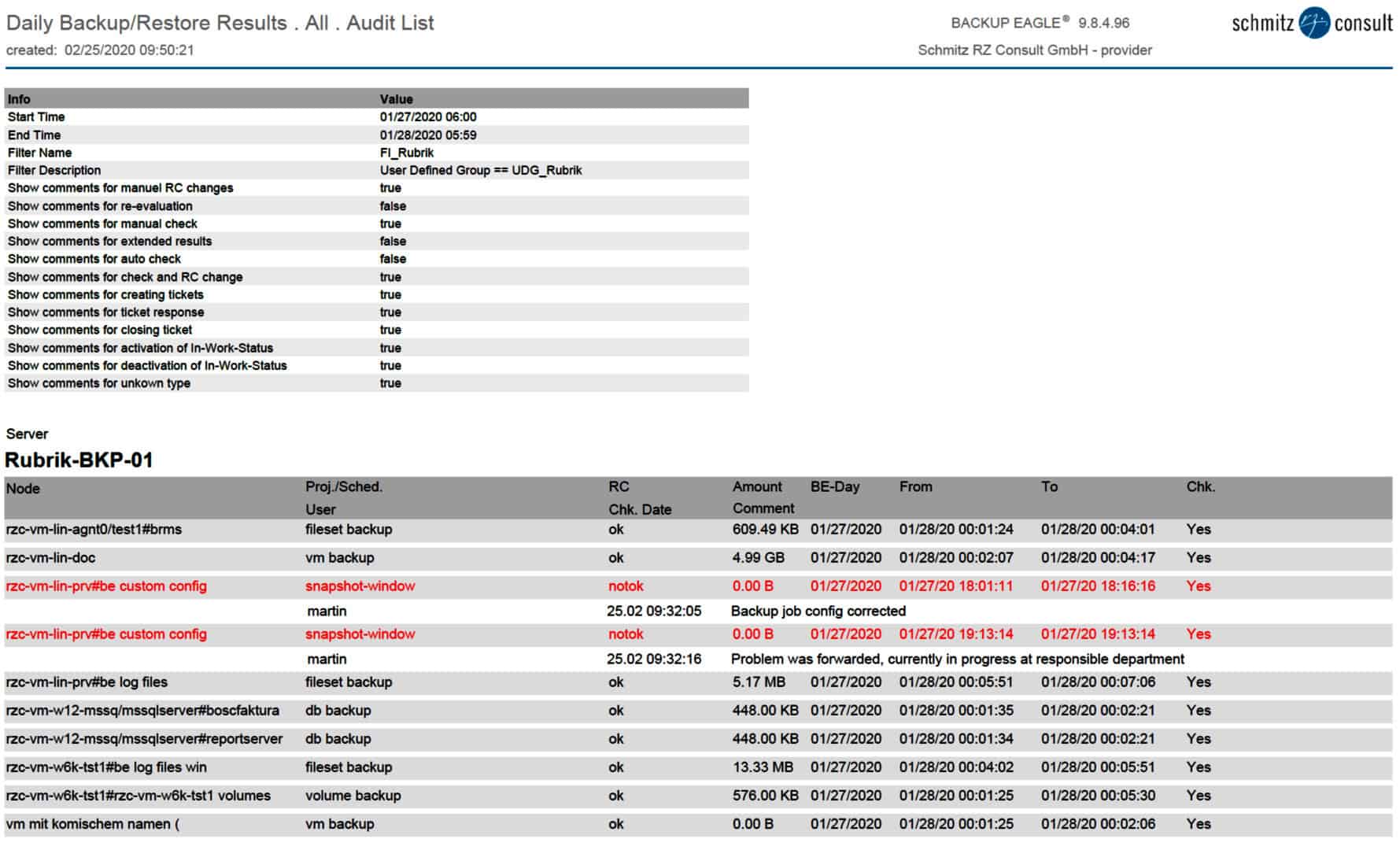 All BACKUP EAGLE® reports can be configured for any period of time and any desired format (~.pdf, ~.html, ~.csv, ~.xls). Content can be easily filtered (servers, nodes, schedules, domains, return codes, …). The BACKUP EAGLE® standard reports are automatically generated daily.